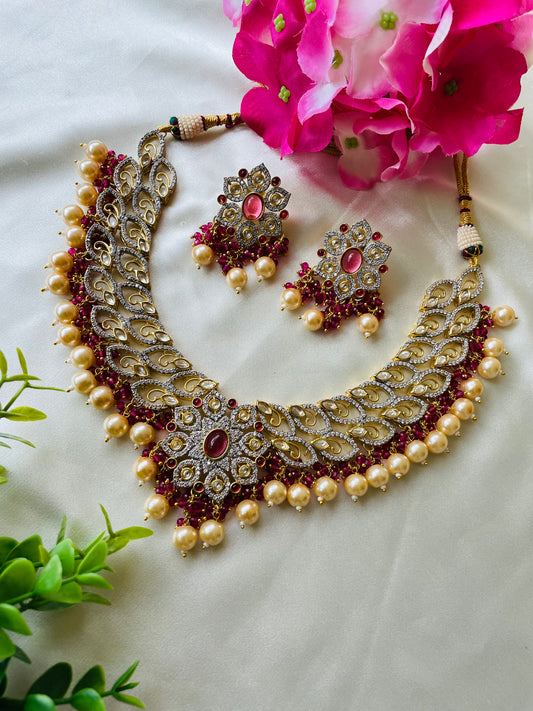Statement neck piece with earrings and tikka in mehroon colour