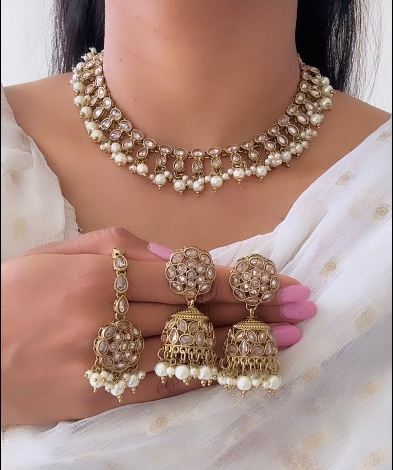 Beautiful necklace with jhumki and tikka in fine reverse Polki