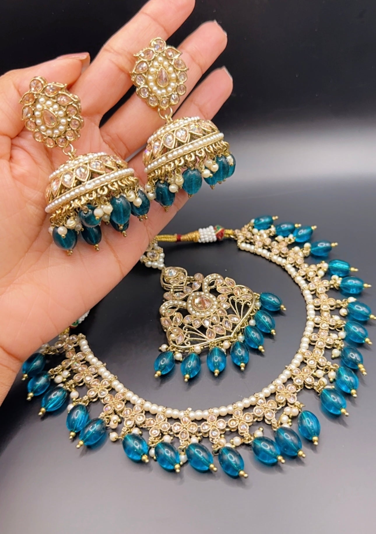 Beautiful necklace with jhumki and tikka in fine reverse Polki
