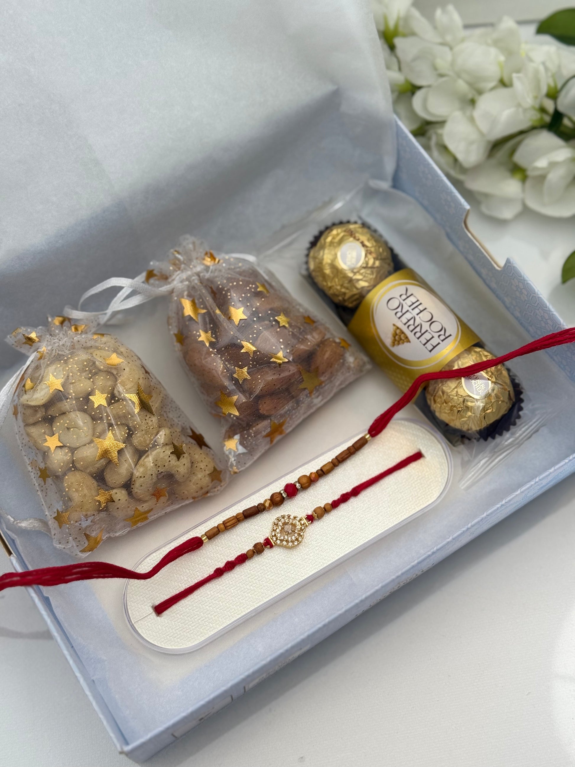 Premium Adult Rakhi + 1 Rakhi thread + dry nuts + chocolate