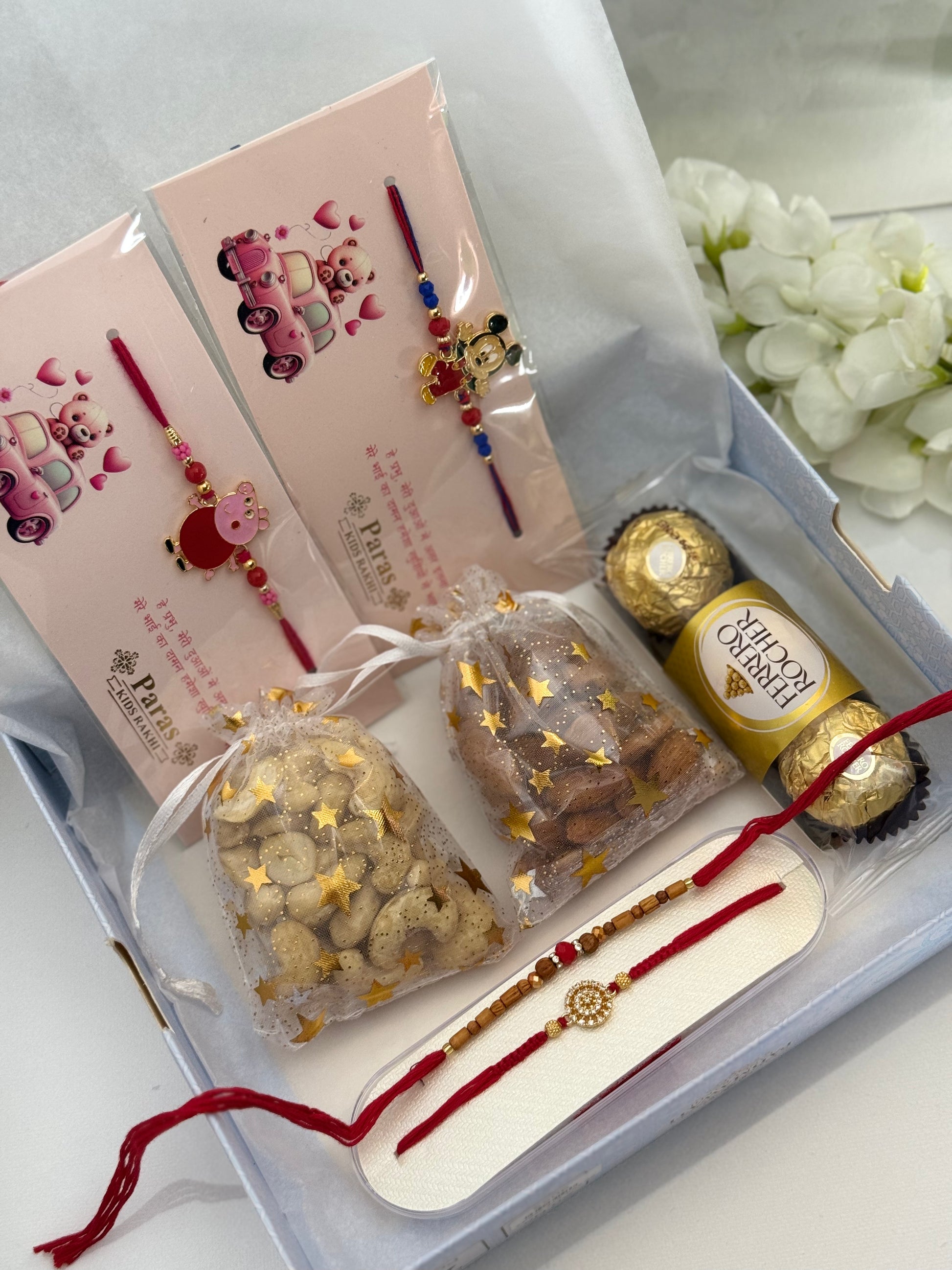 One premium Adult Rakhi + 1 Rakhi thread + 2 kids Rakhi + dry nuts + chocolate