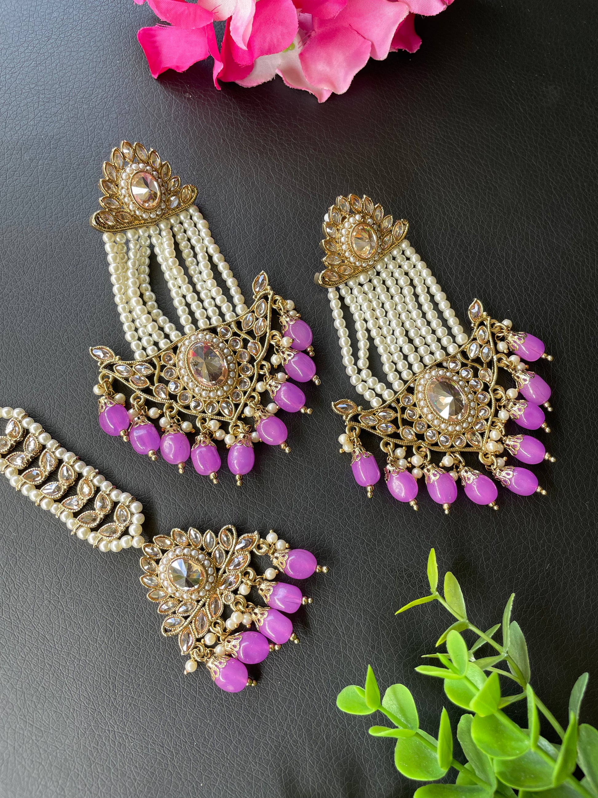 Fine quality reverse polki tikka set in lavender colour